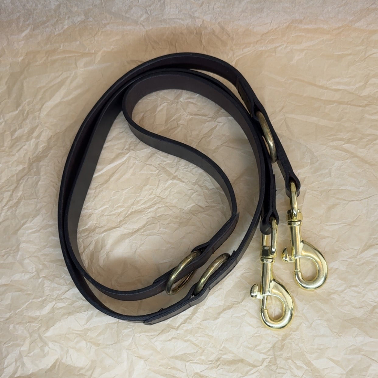 Håndlavet line af ægte læder. Denne line er lavet med 6 forskellige længder, så du selv kan bestemme hvor lang din snor skal være. Du kan også bruge den på to hunde af gangen.