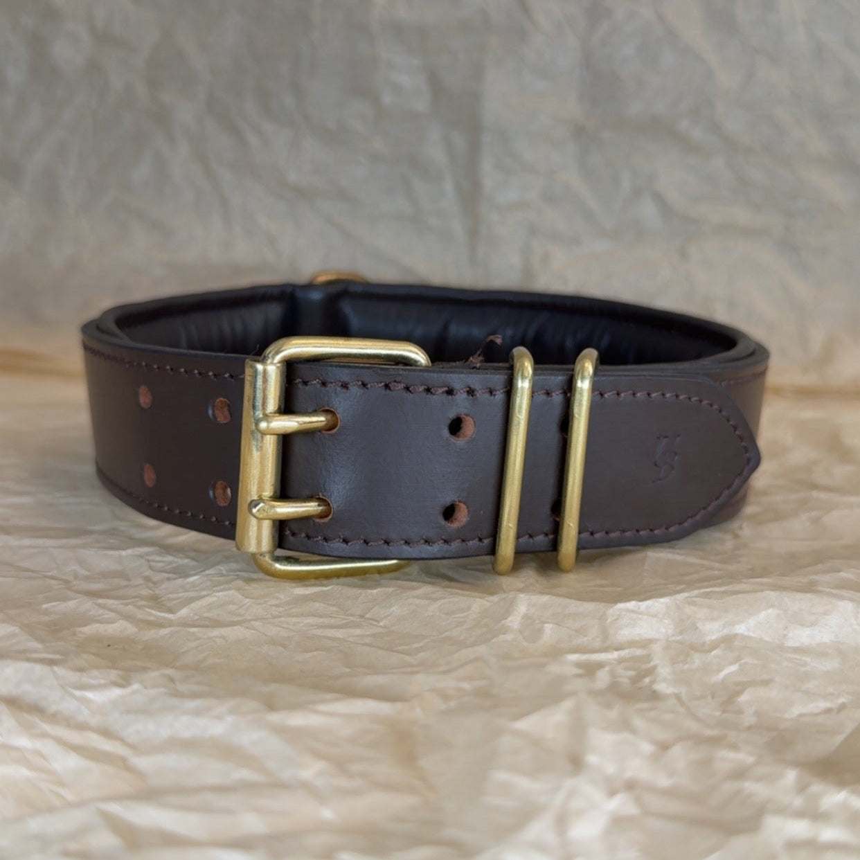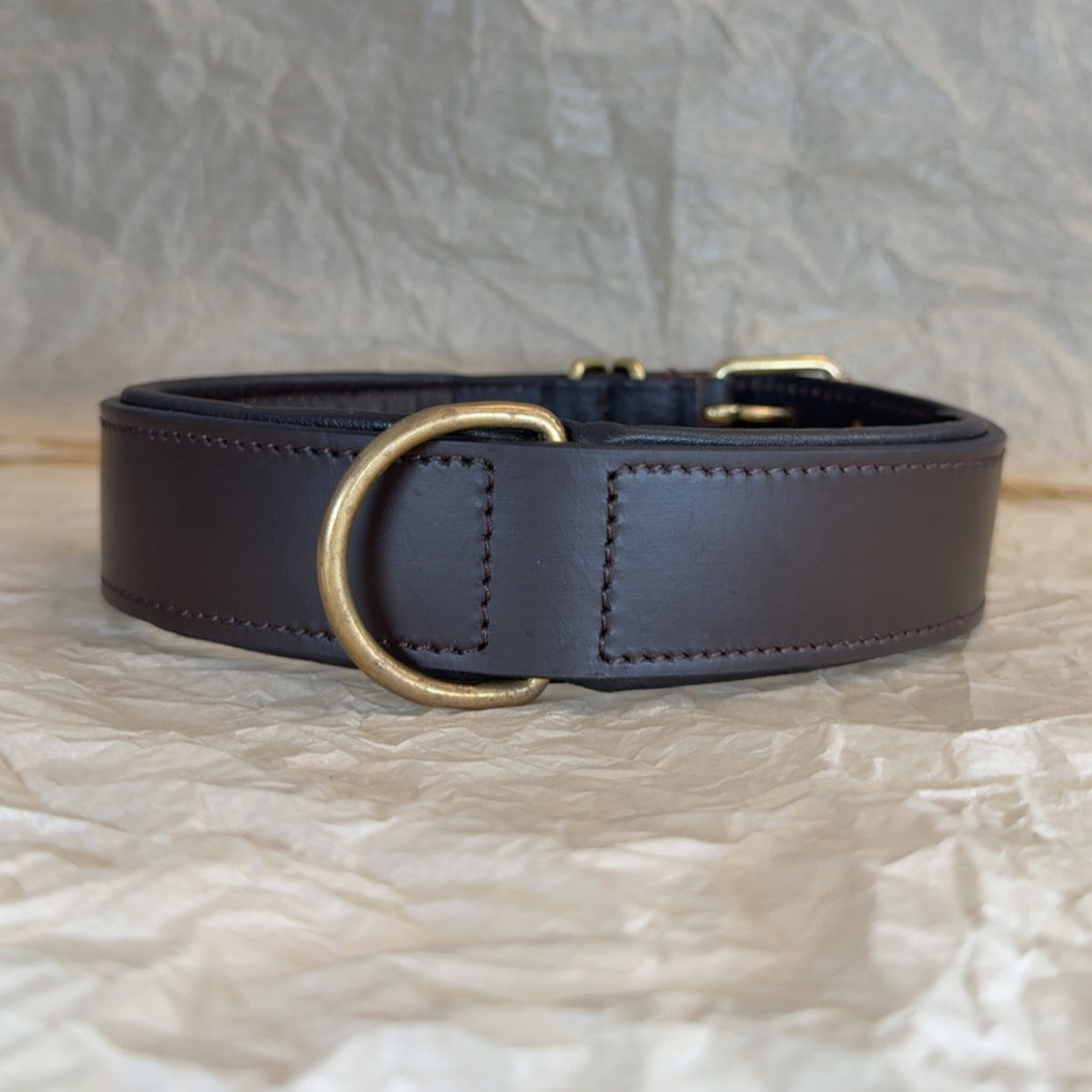 Håndlavet halsbånd i ægte læder, brun og guld.
