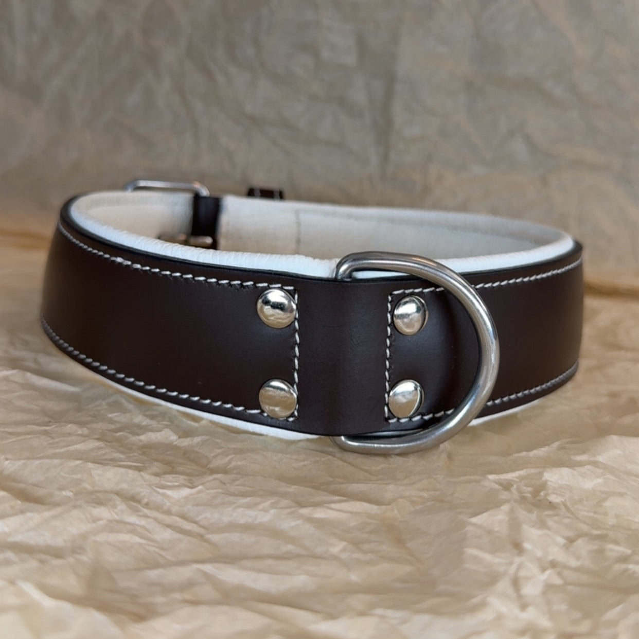 Brunt håndlavet og dobbeltsyet halsbånd i ægte læder med hvid inderkant.