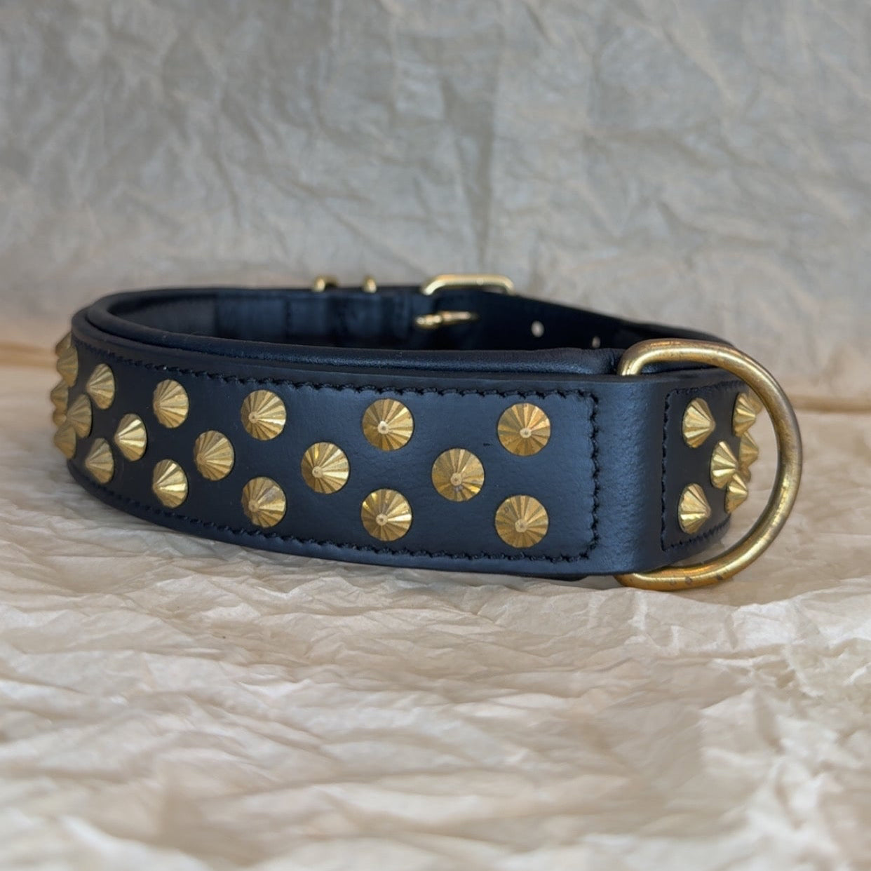 Håndlavet halsbånd i ægte læder, sort og guld.